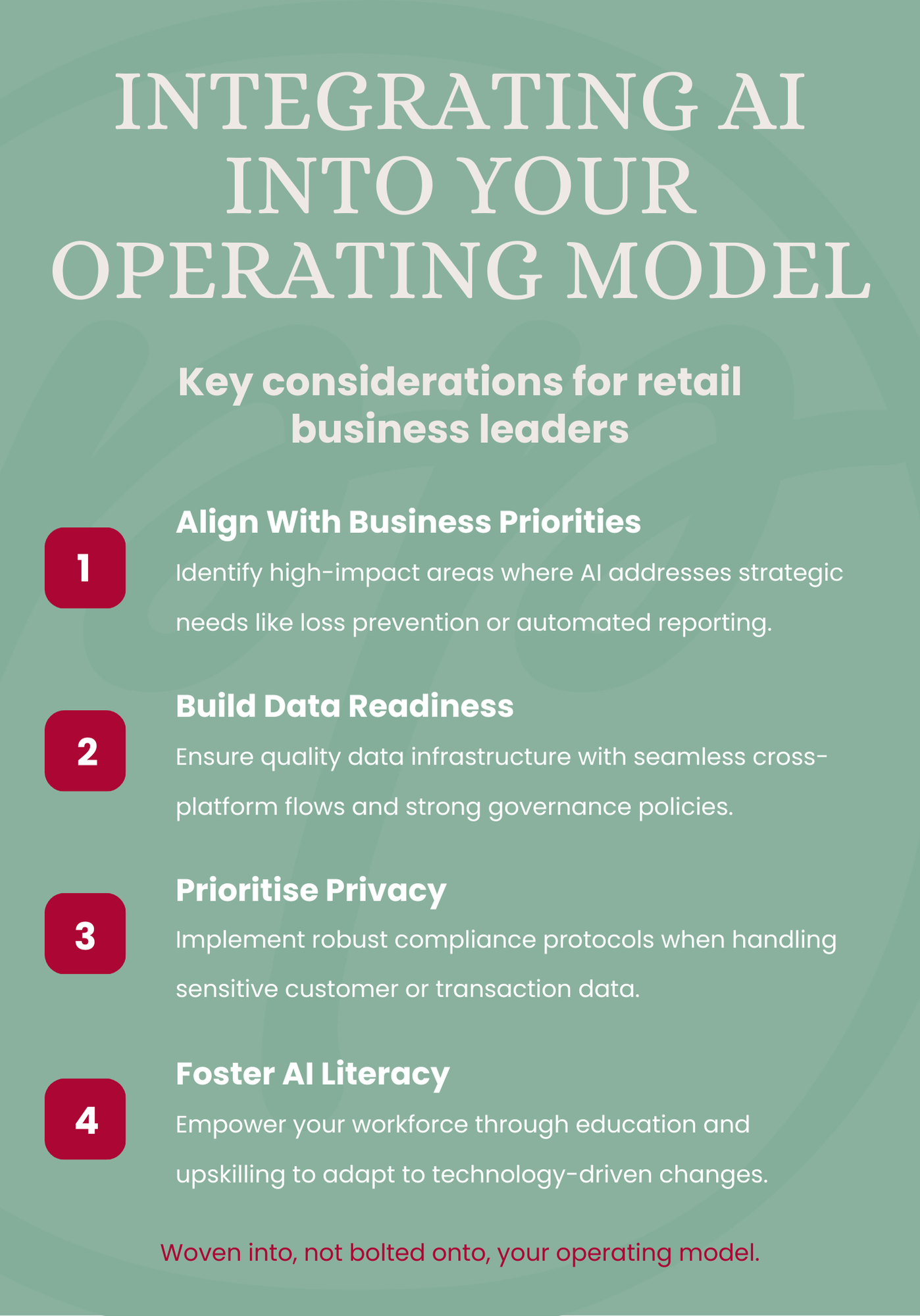 August 2025 15 Aug Written By Alyssa Wong AI in Retail OperationsIntegrating AI in BusinessAI Strategy for Retail LeadersRetail Digital TransformationData Readiness for AIAI Privacy ComplianceWorkforce AI TrainingAI Operating ModelAI Implementation Best PracticesRetail Technology TrendsOperating Model Alyssa Wong